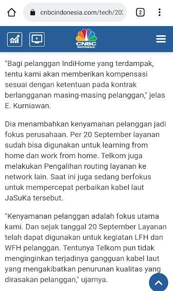 Bagi pelanggan Indihome akan mendapatkan kompensasi terkait kerusakan jaringan ini, sesui yang dituliskan oleh CNBC.